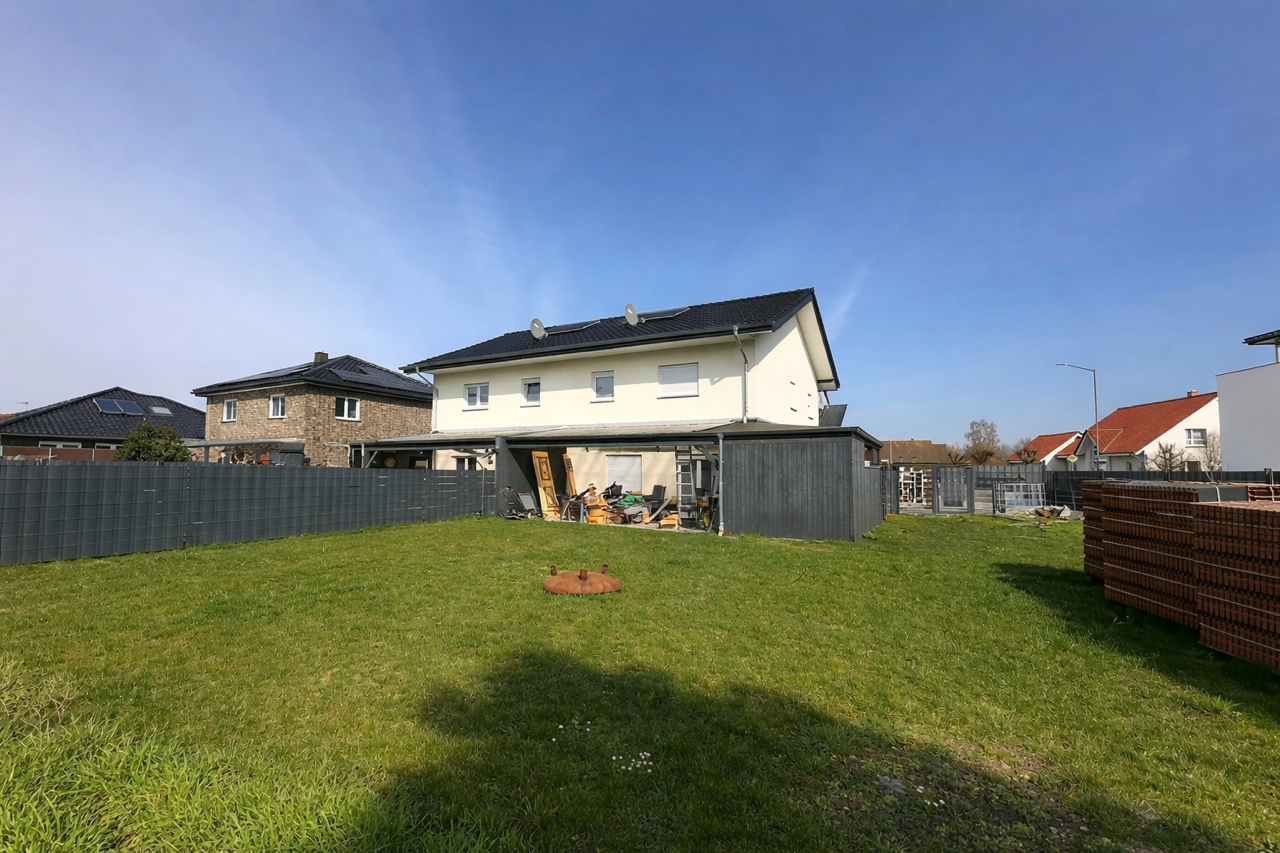 Die moderne Doppelhaushälfte in Holzständerbauweise überzeugt durch komfortables Wohnen und eine gut geschnittene, funktionale Raumaufteilung, die eine angenehme Nutzung aller Wohnbereiche ermöglicht. Eine großzügige, überdachte Terrasse mit angrenzendem südlich gelegenen Garten mit ca. 500qm, bietet viel Platz für Erholung und individuelle Gartengestaltung. Ergänzt wird das Angebot durch eine in Weiß gehaltene Einbauküche, separate Gästetoilette, eine Zisterne mit ca. 7 m³ Fassungsvermögen im Garten sowie ein Carport für bequemes und wettergeschütztes Parken.